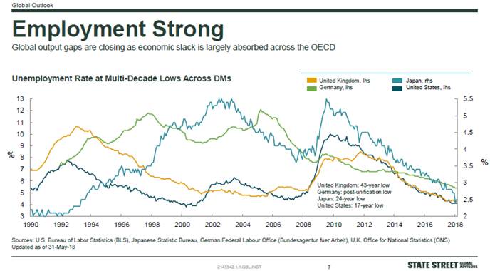 Chart 2: Unemployment in Developed Markets – chart shows US, Japan, Germany, and UK all at simultaneous lows .